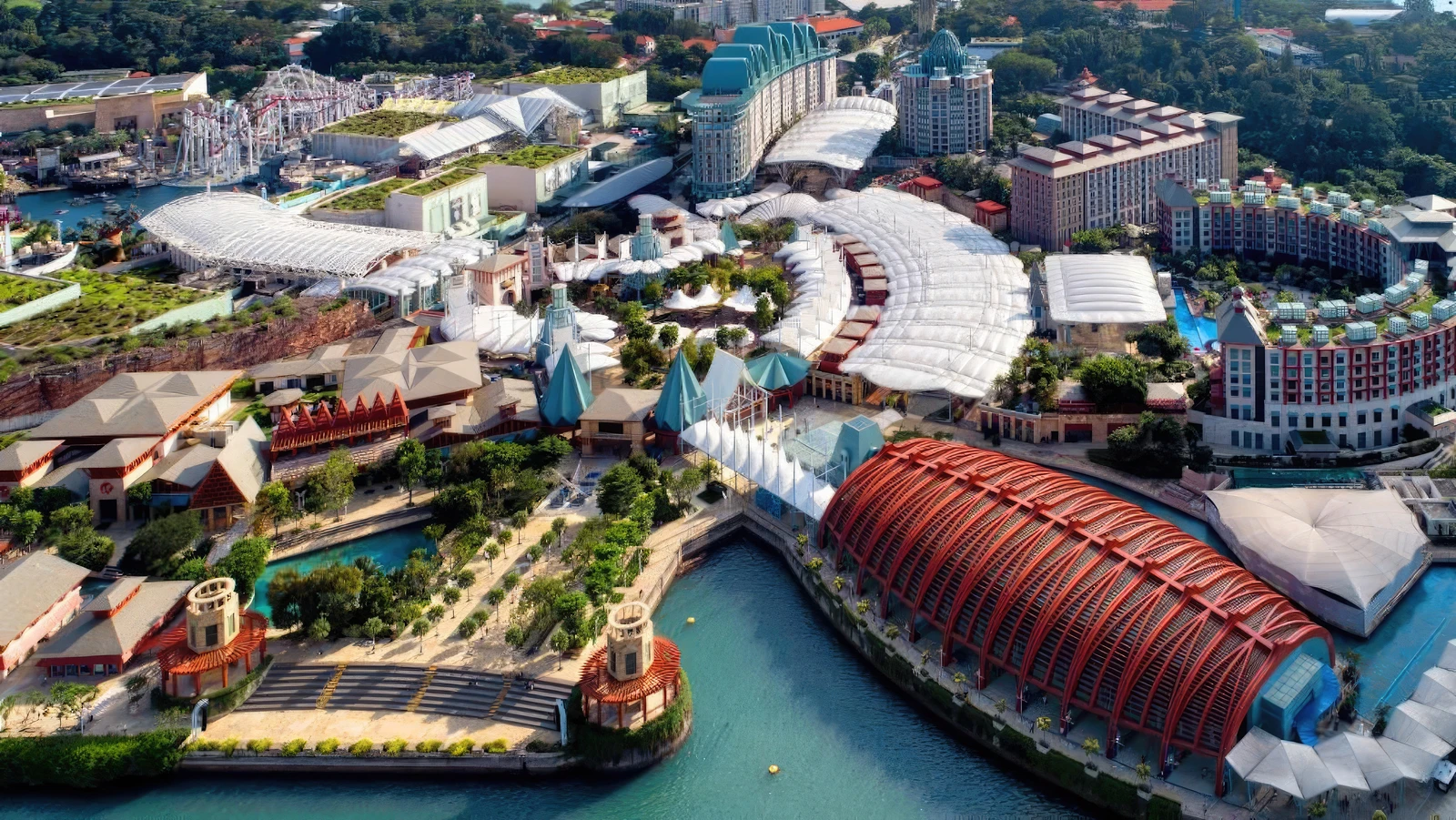 - Integrated Resorts: The dominant architectural feature is Resorts World Sentosa (RWS), a massive integrated resort (49 hectares) that includes: