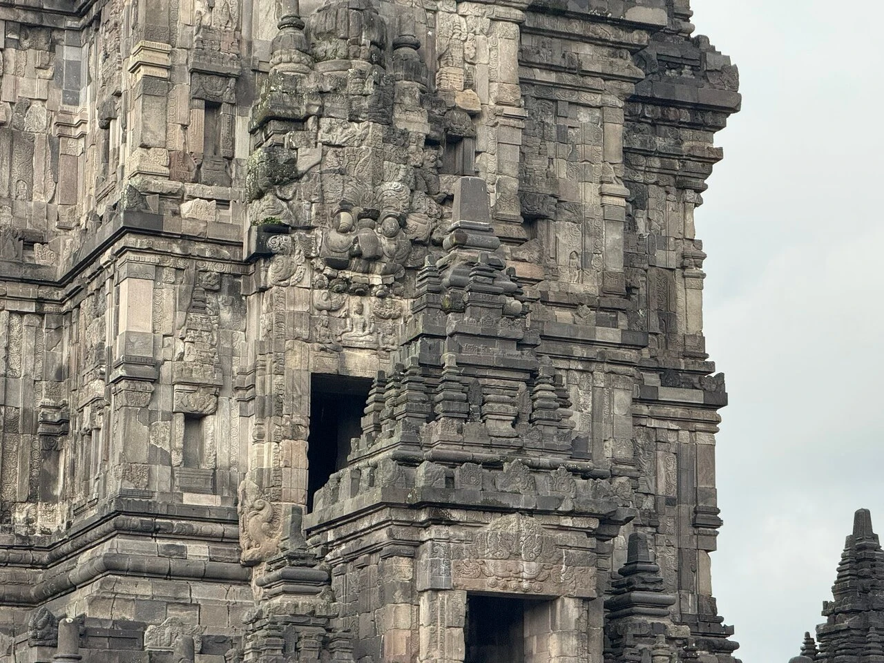 - High and Pointed Architecture: Unlike the more sprawling, stepped pyramid form of Borobudur, Prambanan’s temples are distinctly high and pointed (shikhara style), reflecting the typical architecture of Hindu temples found in India. This upward-reaching design is meant to direct the worshipper’s gaze skyward towards the heavens and the gods.