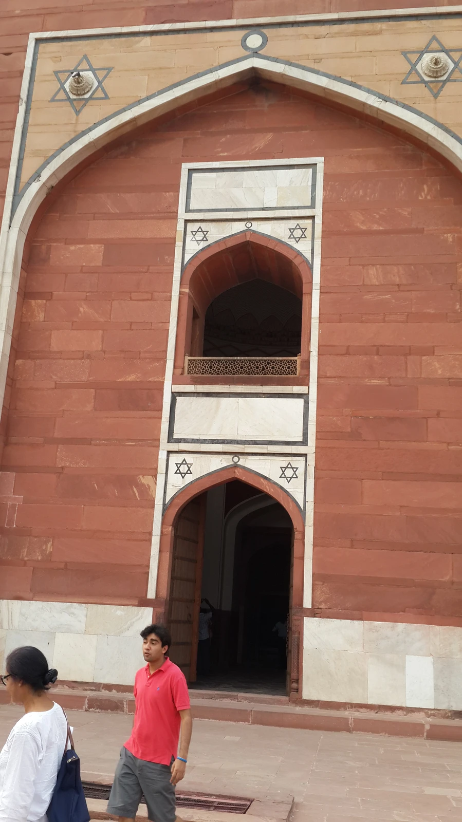 • Red Sandstone and White Marble: The primary construction material is red sandstone, which provides a striking visual contrast with the extensive use of white marble for the double dome, the intricate inlay work, lattice screens (jali), and decorative borders. This combination of red sandstone and white marble became a hallmark of later Mughal architecture.