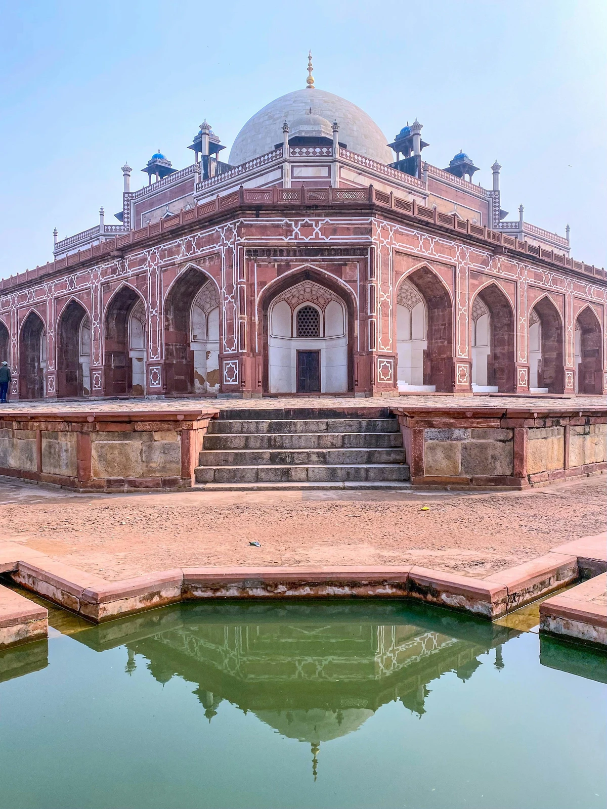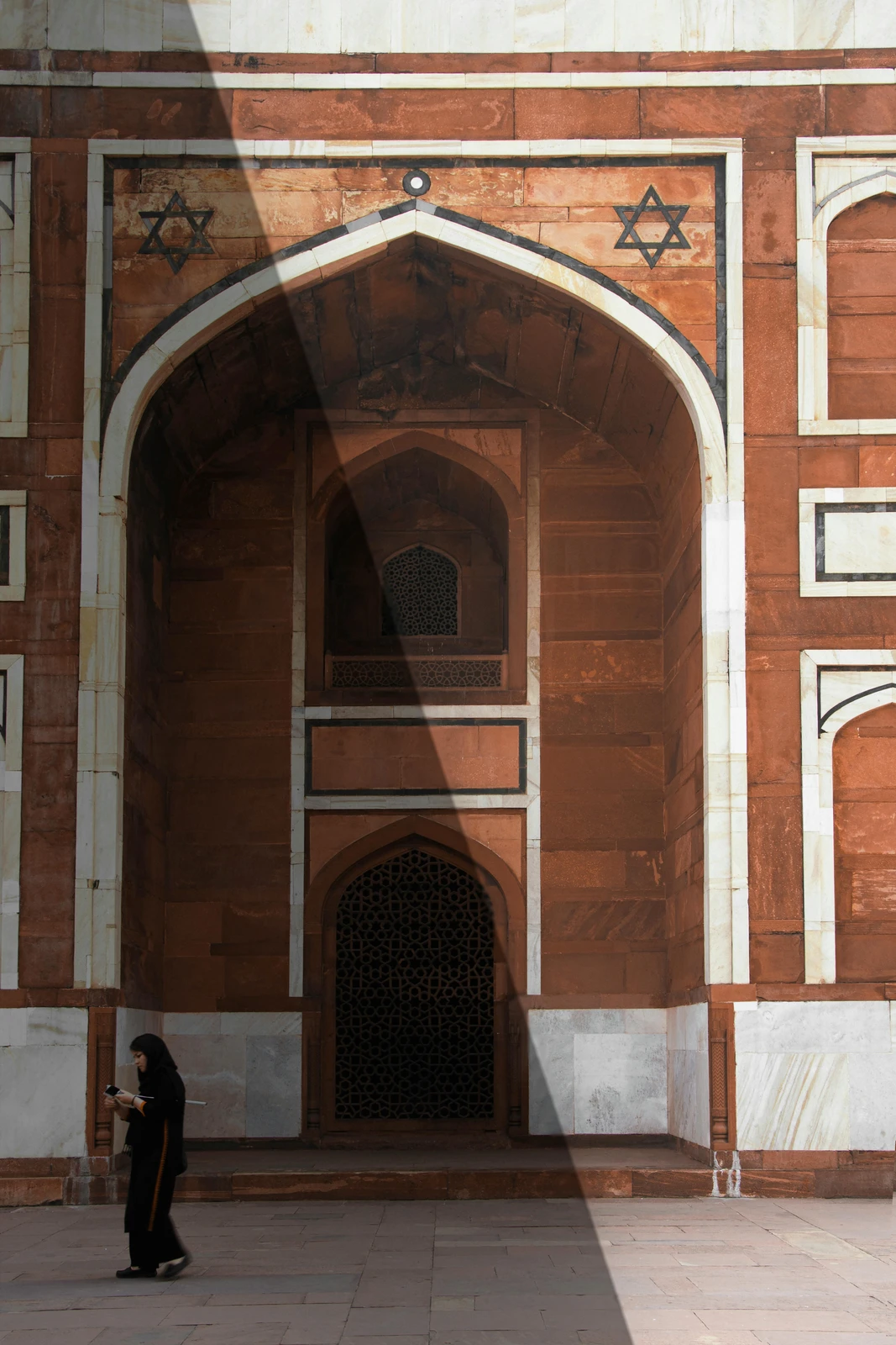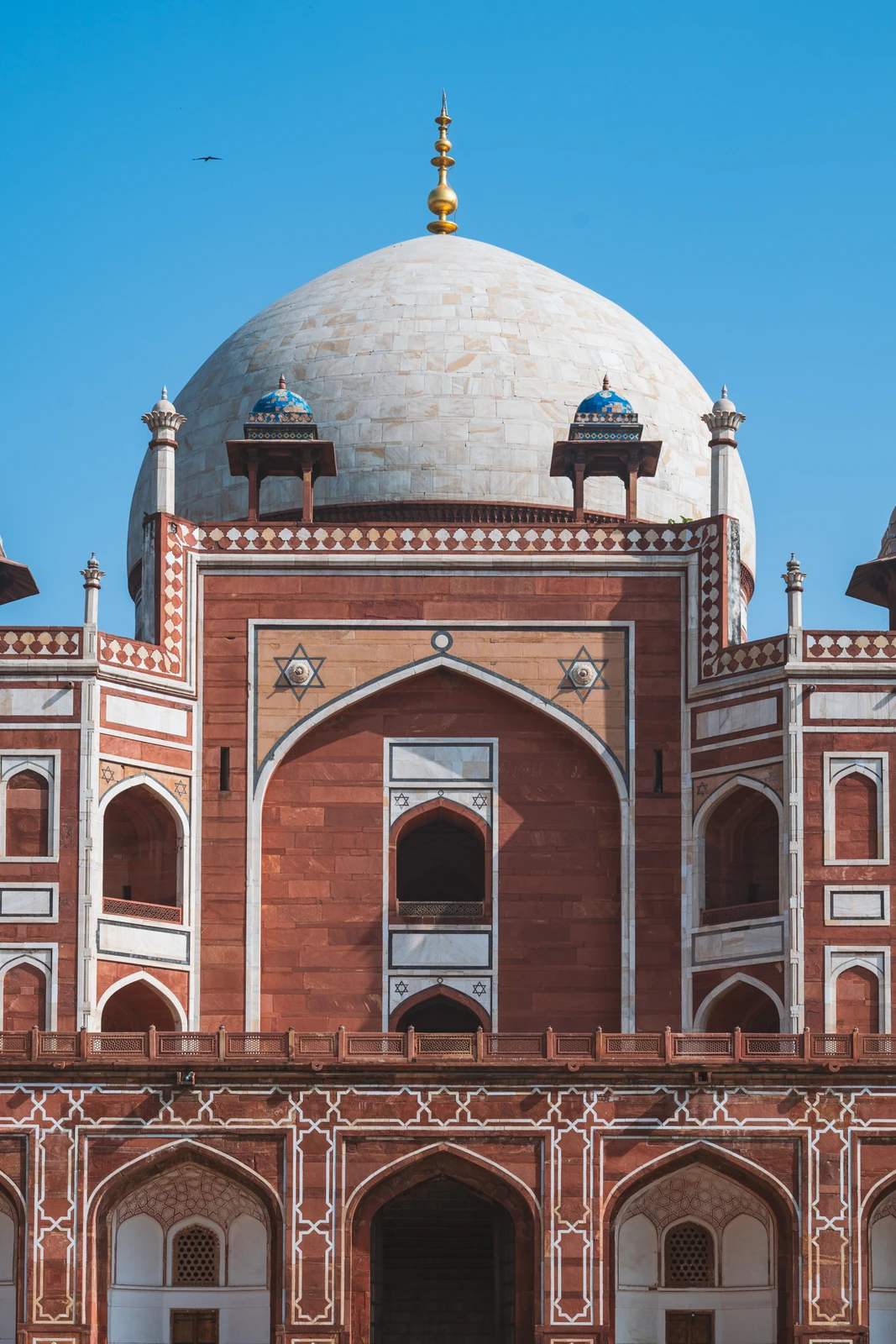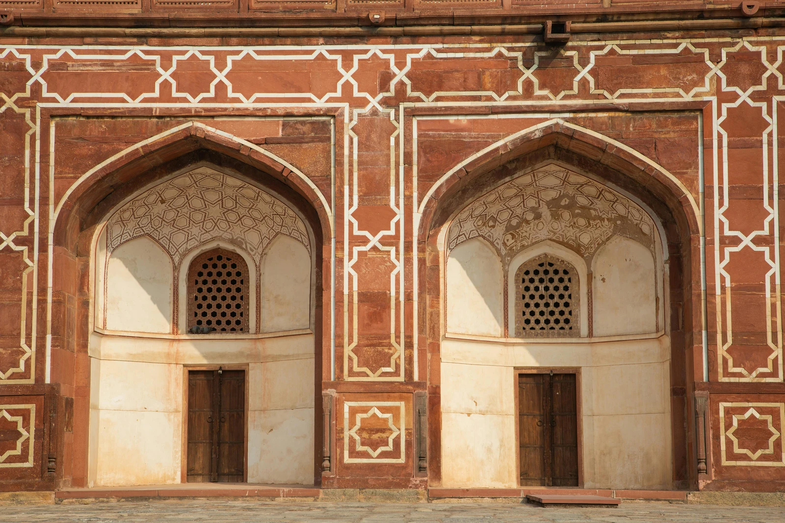 • Red Sandstone Dominance with White Marble Accents: While the Taj Mahal is primarily white marble with red sandstone accents, Humayun’s Tomb reverses this, featuring predominantly red sandstone with striking white marble details, showcasing an earlier aesthetic preference in Mughal construction.