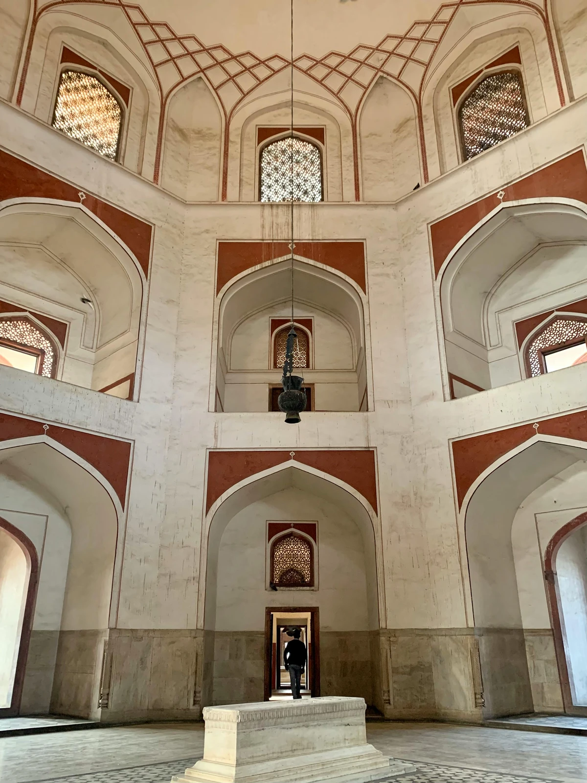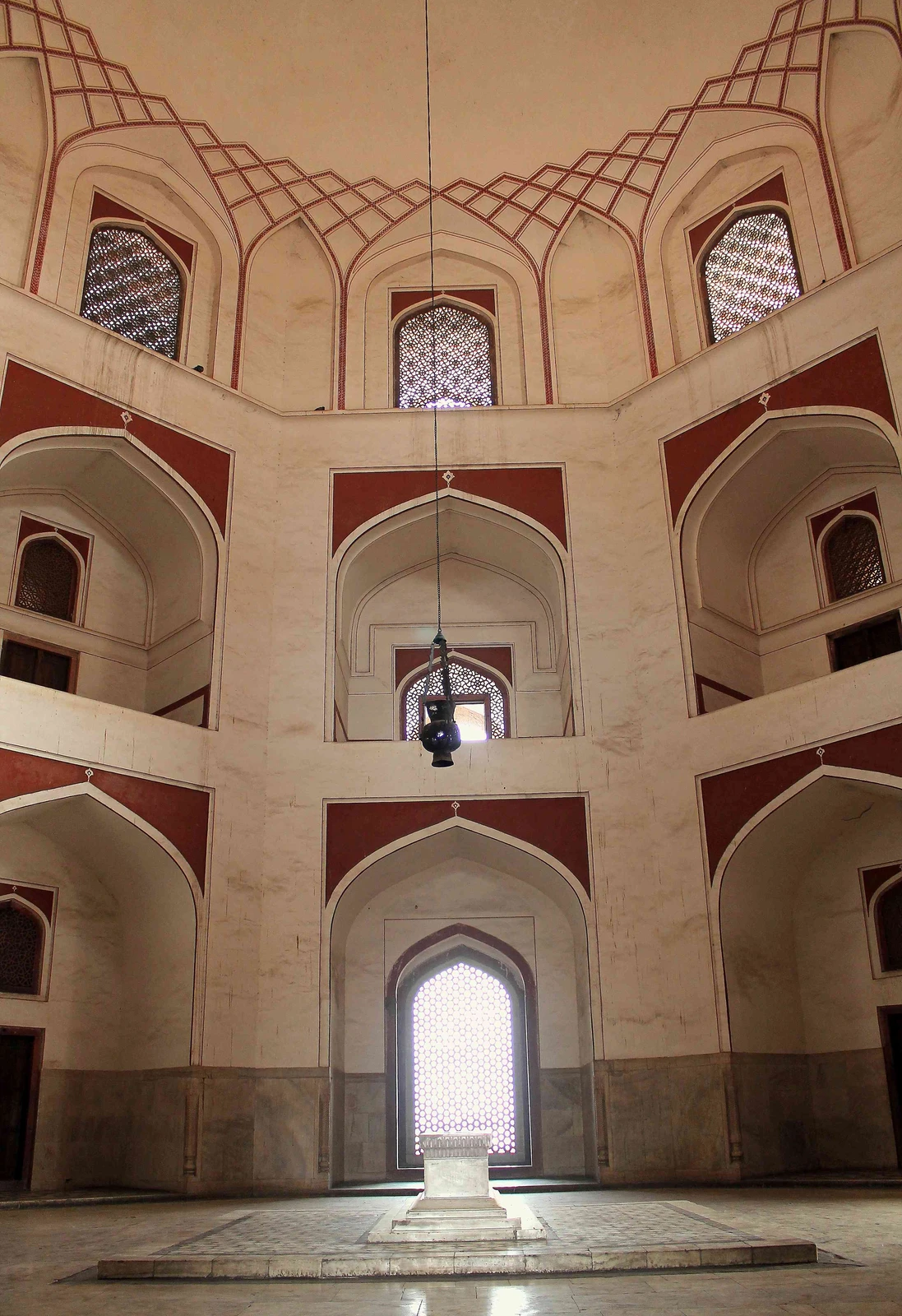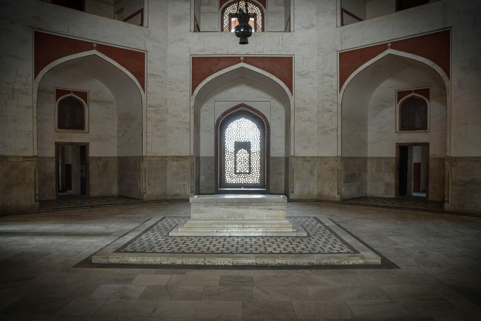 • Interior Layout: The interior of the main mausoleum features a large octagonal central chamber containing Humayun’s cenotaph. This central chamber is connected by galleries or corridors to smaller octagonal chambers at the diagonals, which house the graves of other Mughal family members (over 150 burials, earning it the nickname “dormitory of the Mughals”).