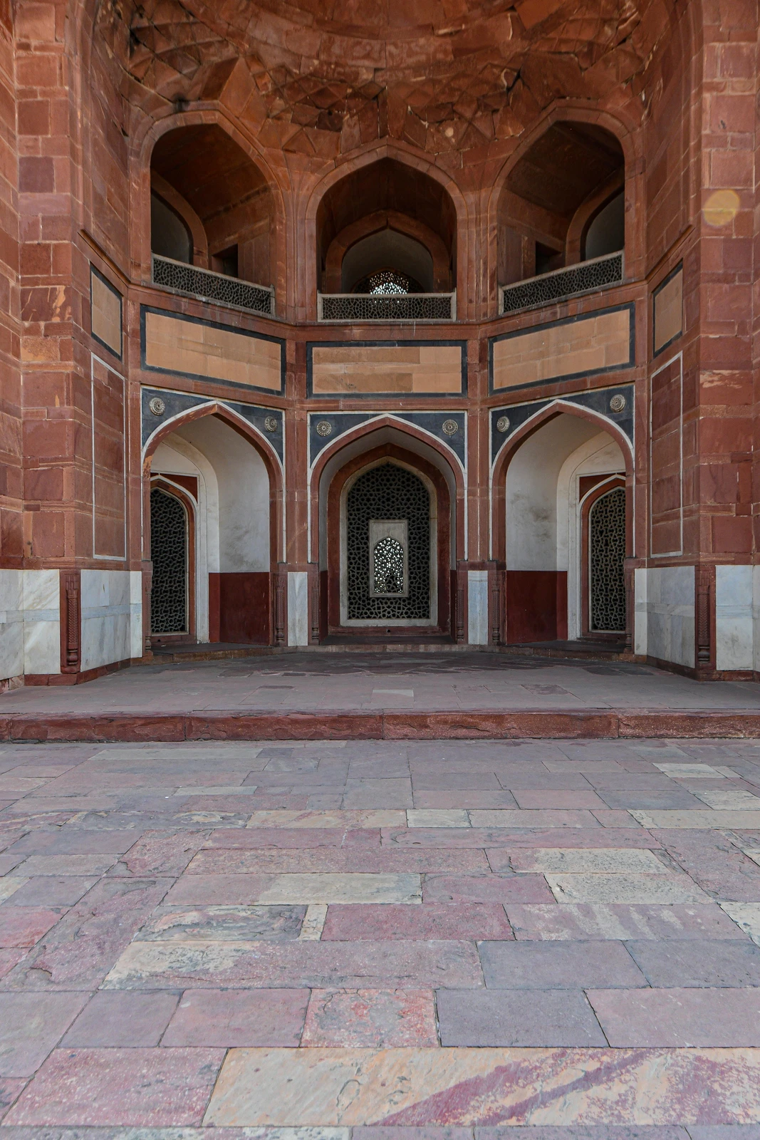 • Arched Alcoves and Recesses: The middle of each side of the mausoleum features deep, large arched alcoves (iwans), with a series of smaller ones set into the facade, creating a grand and inviting entrance on all four sides. The openings are often closed with intricate perforated marble screens (jali).