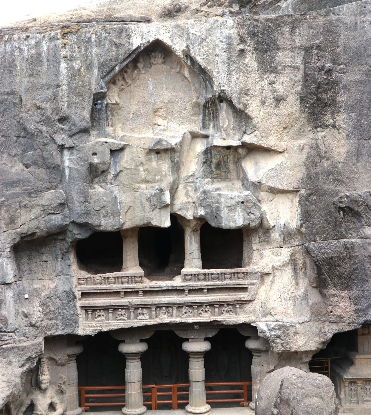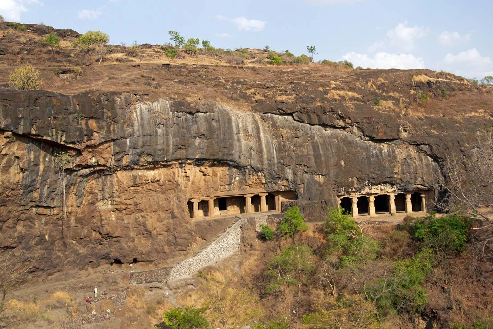 - Basalt Cliff Face: The 34 main caves are excavated into the vertical face of a high basalt cliff, formed from the ancient Deccan Traps volcanic activity. The cliff runs in a semi-circular arc, with the Buddhist caves at one end, the Jain caves at the other, and the Hindu caves in the center.