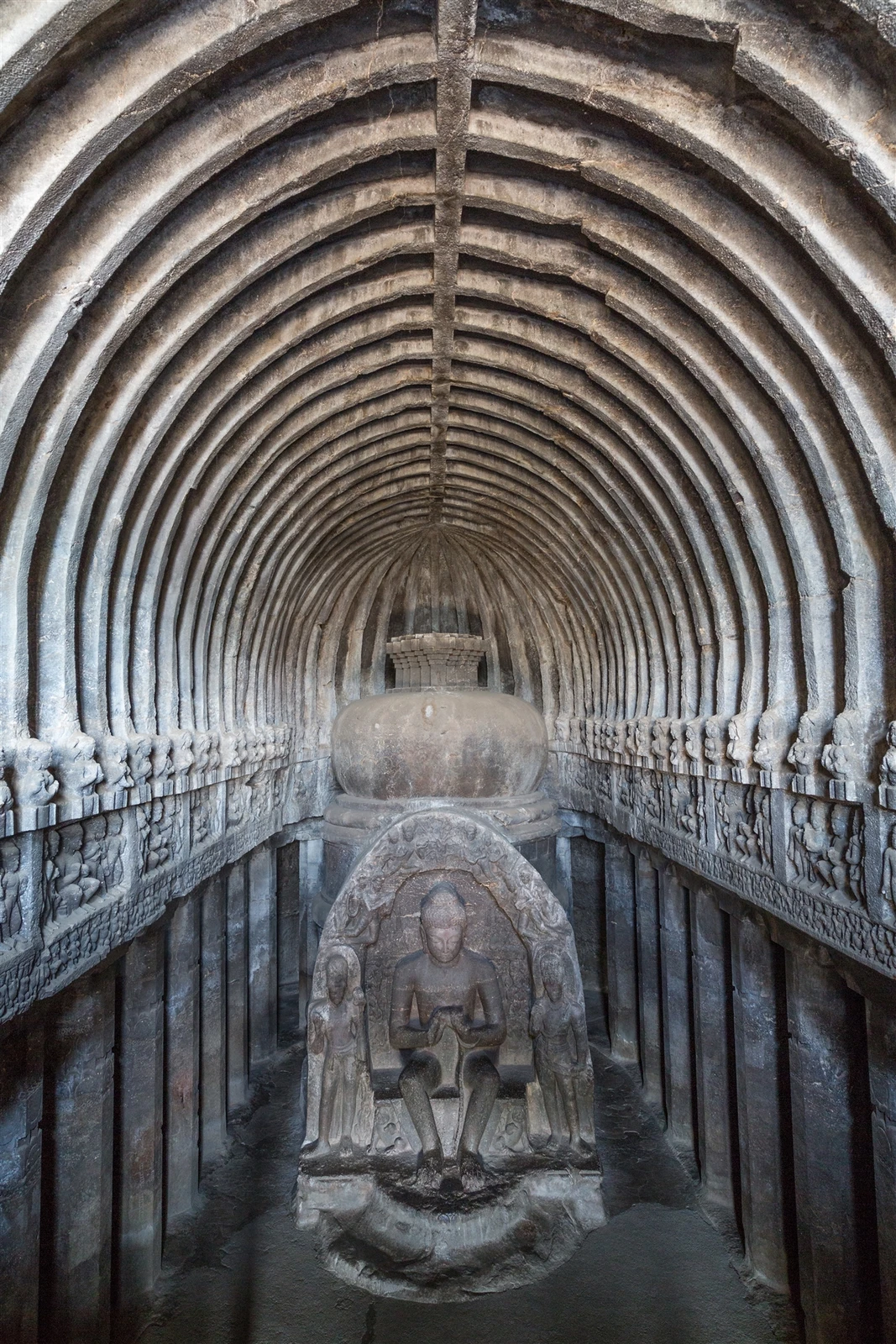 - Buddhist Caves (Caves 1-12): Dating from around 600-700 CE, these typically consist of viharas (monasteries with living quarters, cells, and halls) and chaityas (prayer halls with stupas). They are characterized by their simple, austere design and serene sculptures of Buddha and Bodhisattvas. Cave 10, the Vishvakarma Cave or “Carpenter’s Cave,” is famous for its vaulted ceiling meticulously carved to imitate wooden beams.