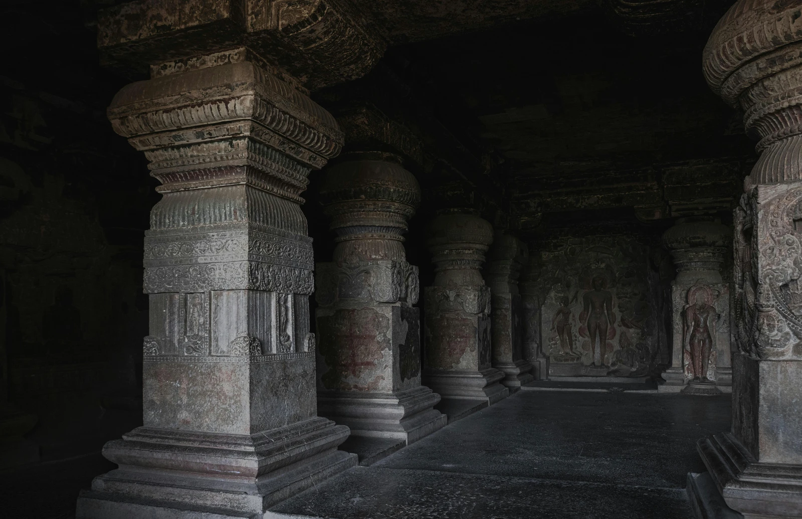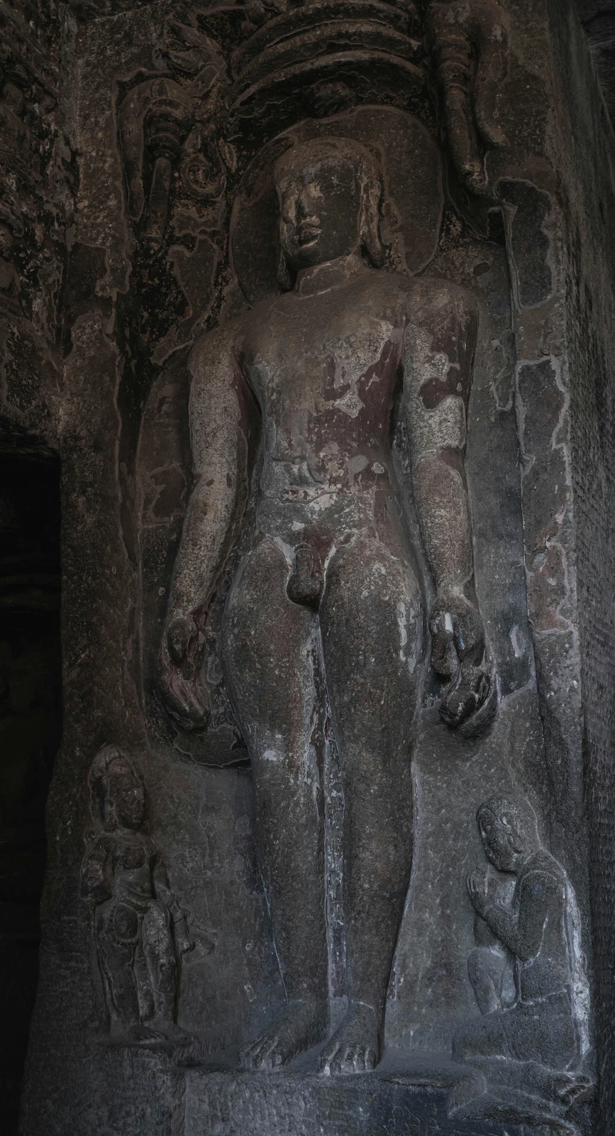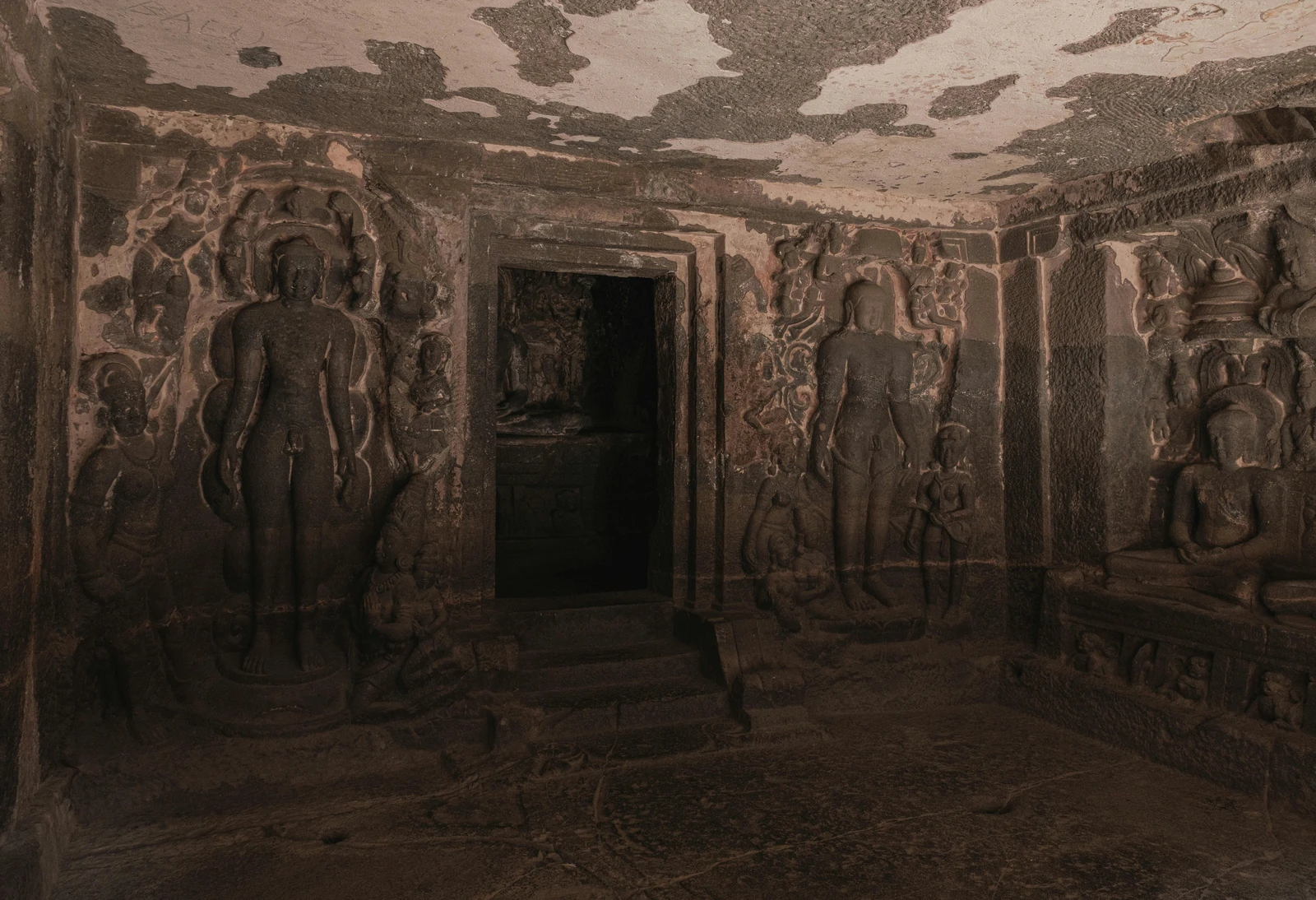- Jain Caves (Caves 30-34): Dating from around 800-1000 CE, these are smaller but highly intricate, known for their ascetic design and detailed sculptures of Jain Tirthankaras (saints) and symbolic motifs. Cave 32, the Indra Sabha, is a notable two-story Jain cave with elaborate carvings and a beautifully adorned shrine.