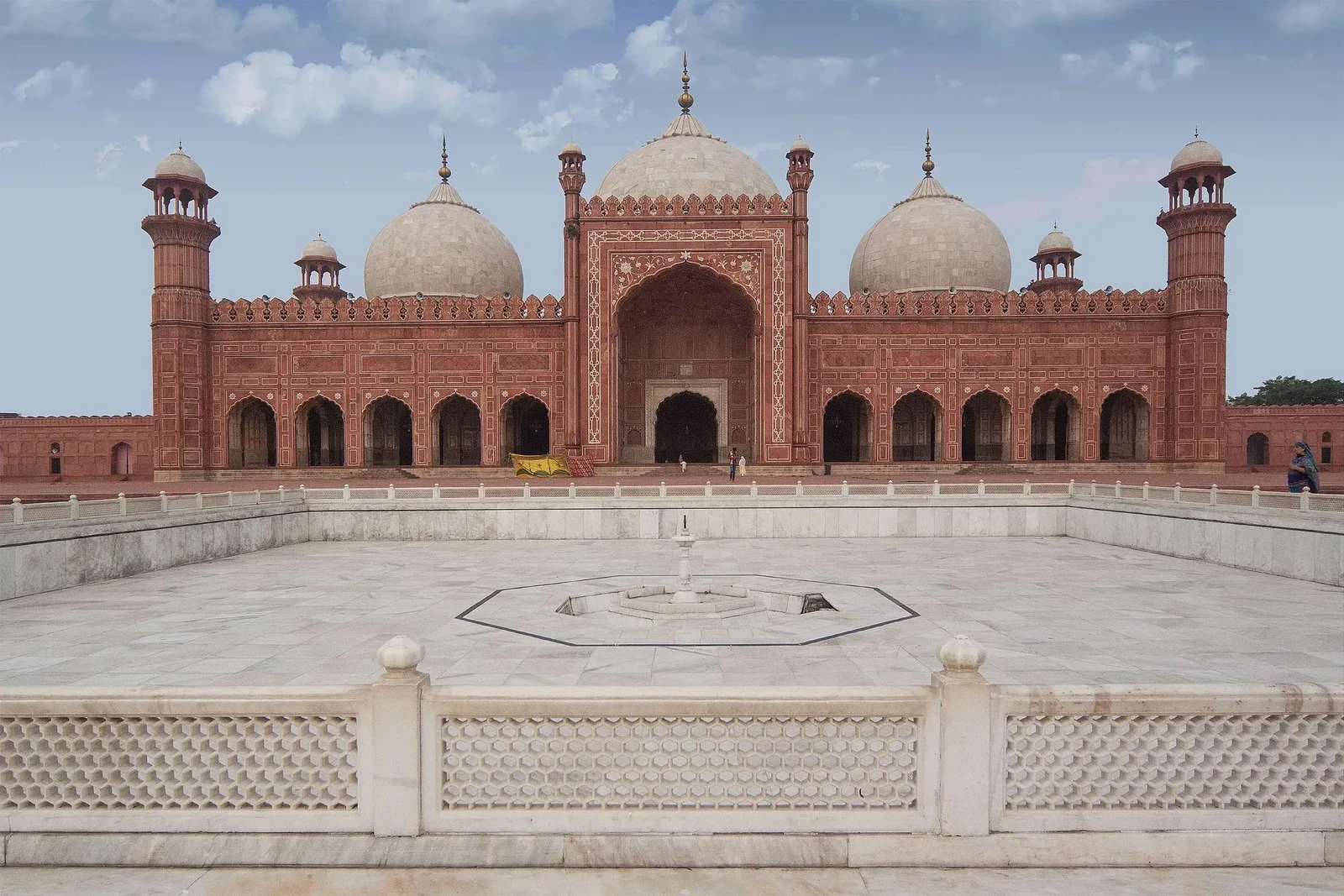 - Use of Red Sandstone with White Marble Inlay (Specific Balance): While the Jama Masjid in Delhi (built by Shah Jahan) shares a similar design and materials, the Badshahi Mosque uses a particular balance of red sandstone as the dominant exterior material with extensive white marble inlay, contrasting with the primary white marble of the Taj Mahal or the red sandstone dominance of Delhi’s Red Fort.