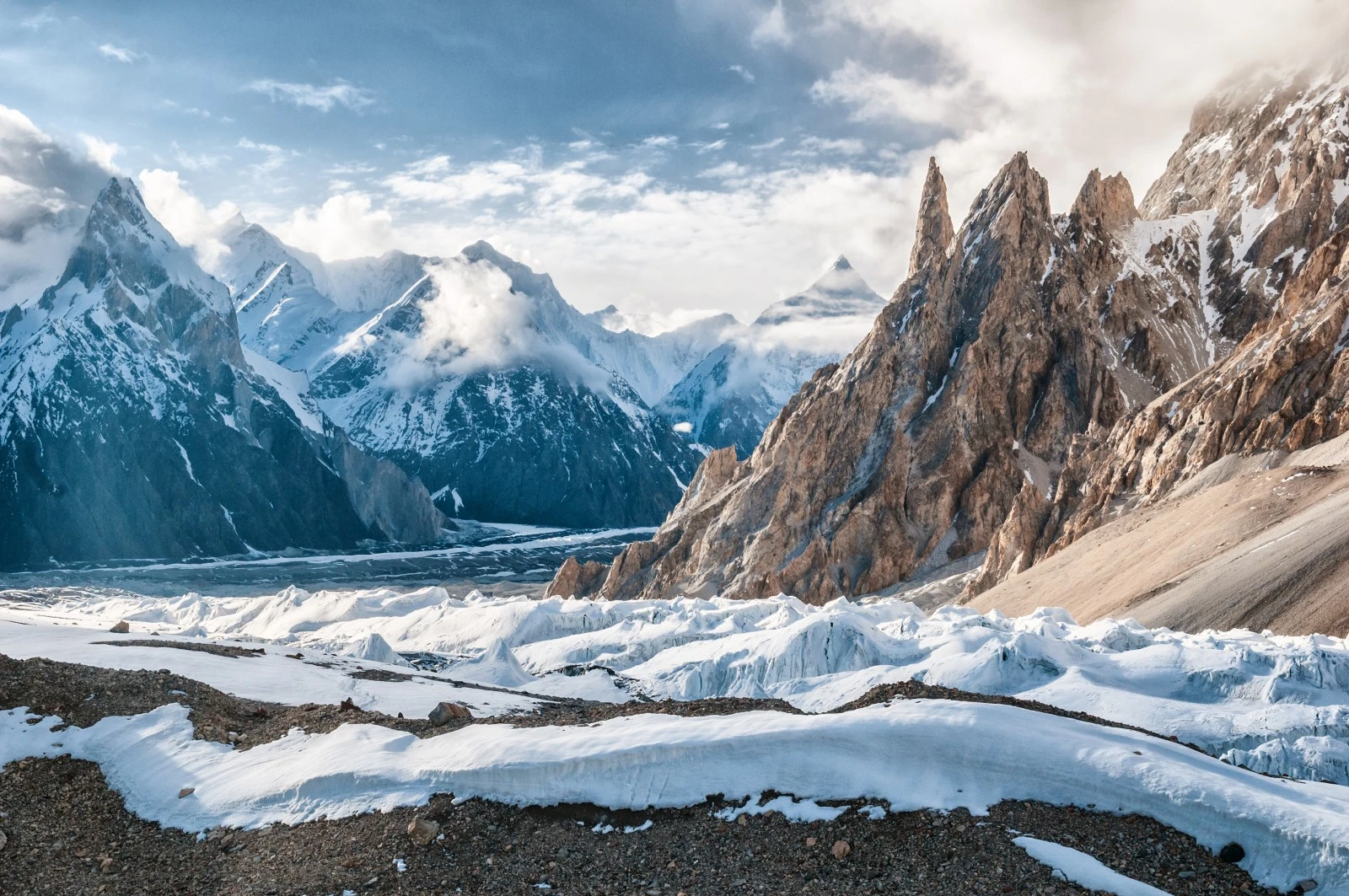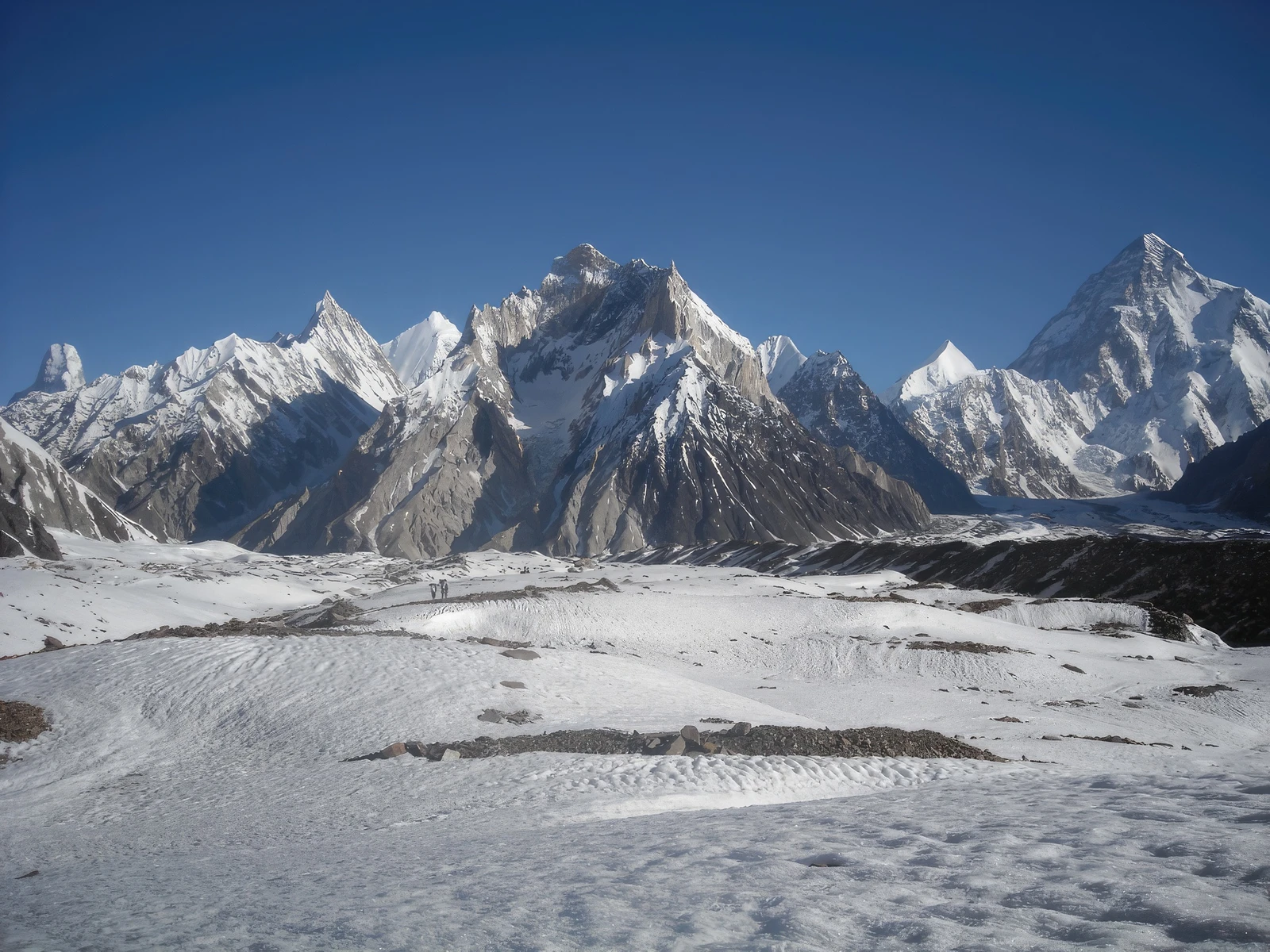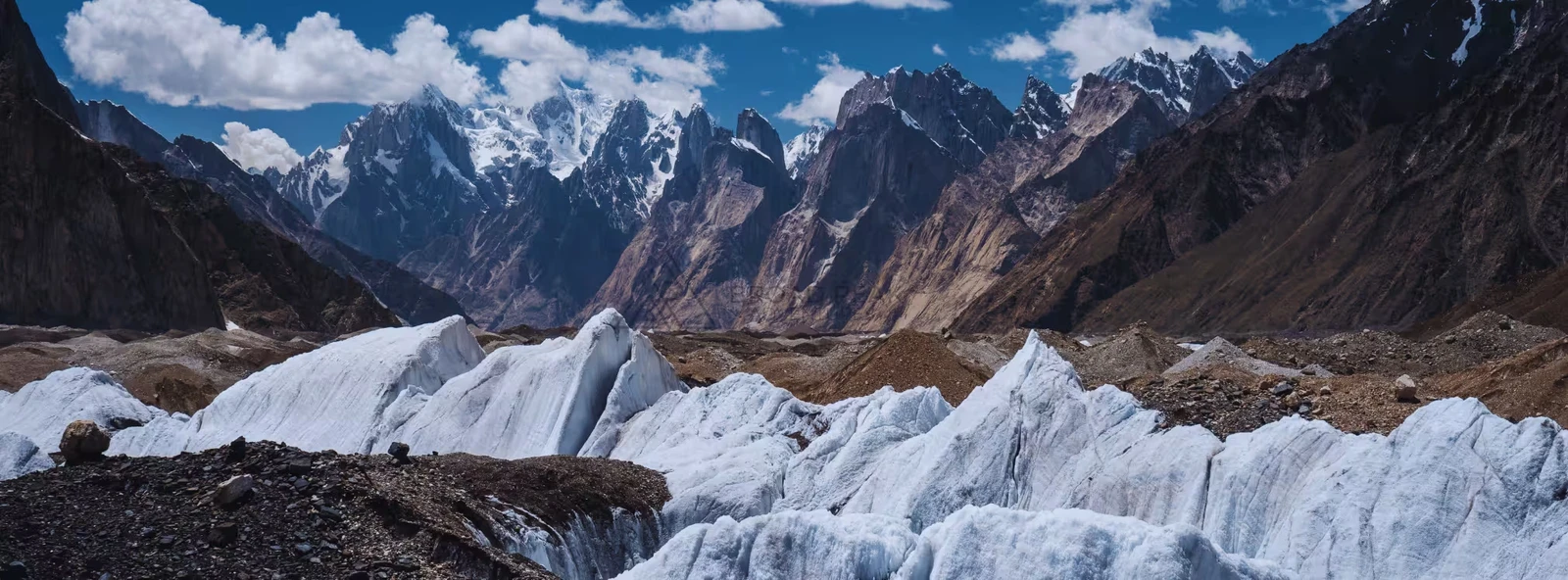 - “Throne Room of the Mountain Gods” (Concordia): The glacier’s most famous intersection is Concordia, where the Baltoro Glacier meets the Godwin-Austen Glacier (flowing from K2). This area is famously known as the “Throne Room of the Mountain Gods” because it offers a spectacular 360-degree panoramic view of four 8,000-meter peaks (K2, Broad Peak, Gasherbrum I/Hidden Peak, Gasherbrum II) and numerous other towering 7,000-meter peaks, creating an unparalleled amphitheater of giants.