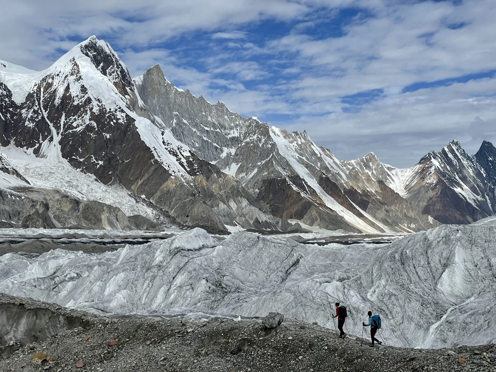 - Trekking On the Glacier: Unlike many mountain treks that follow trails alongside glaciers, the Baltoro trek involves significant portions of walking on the surface of the glacier itself (albeit often debris-covered), providing a unique and challenging terrain experience.