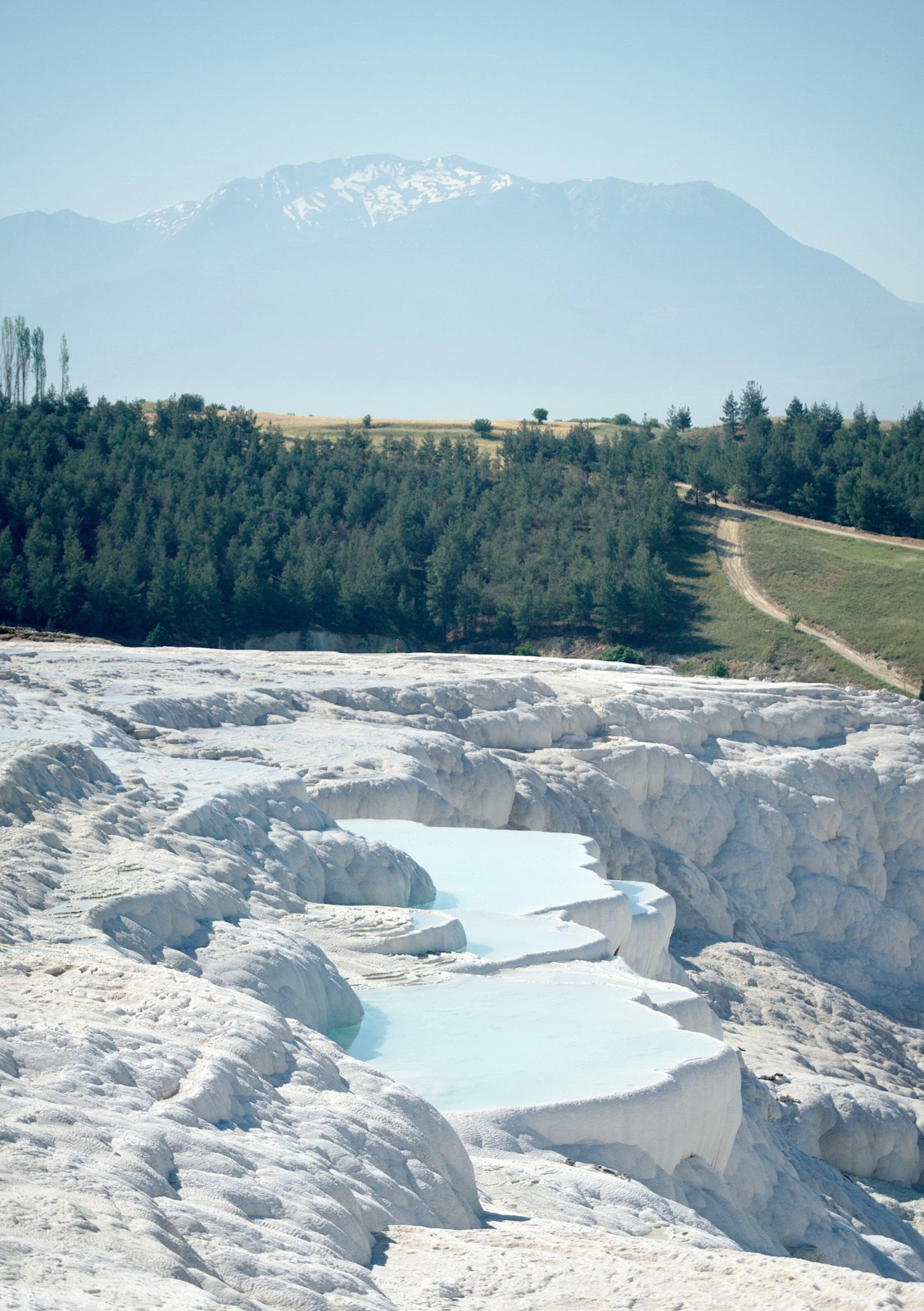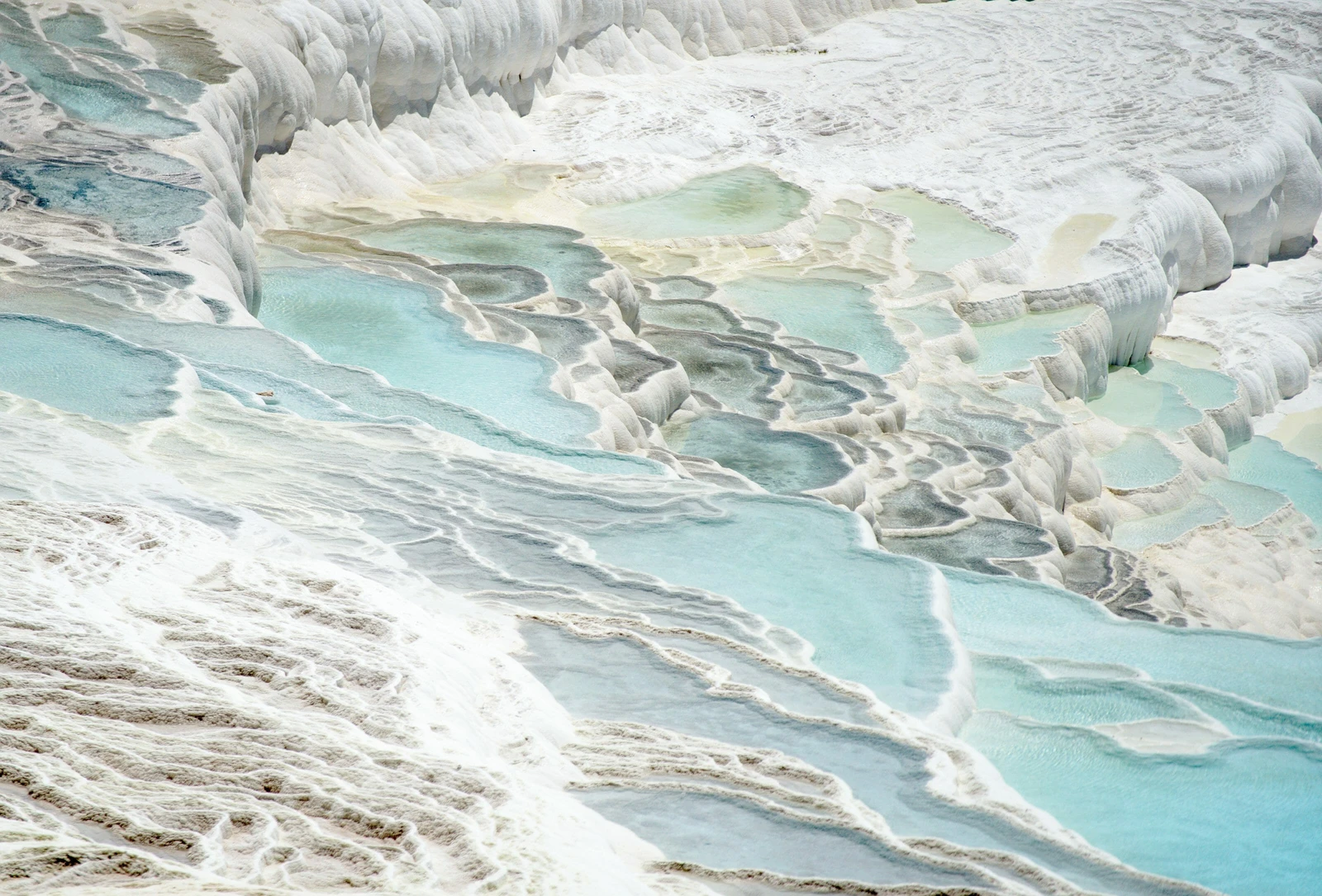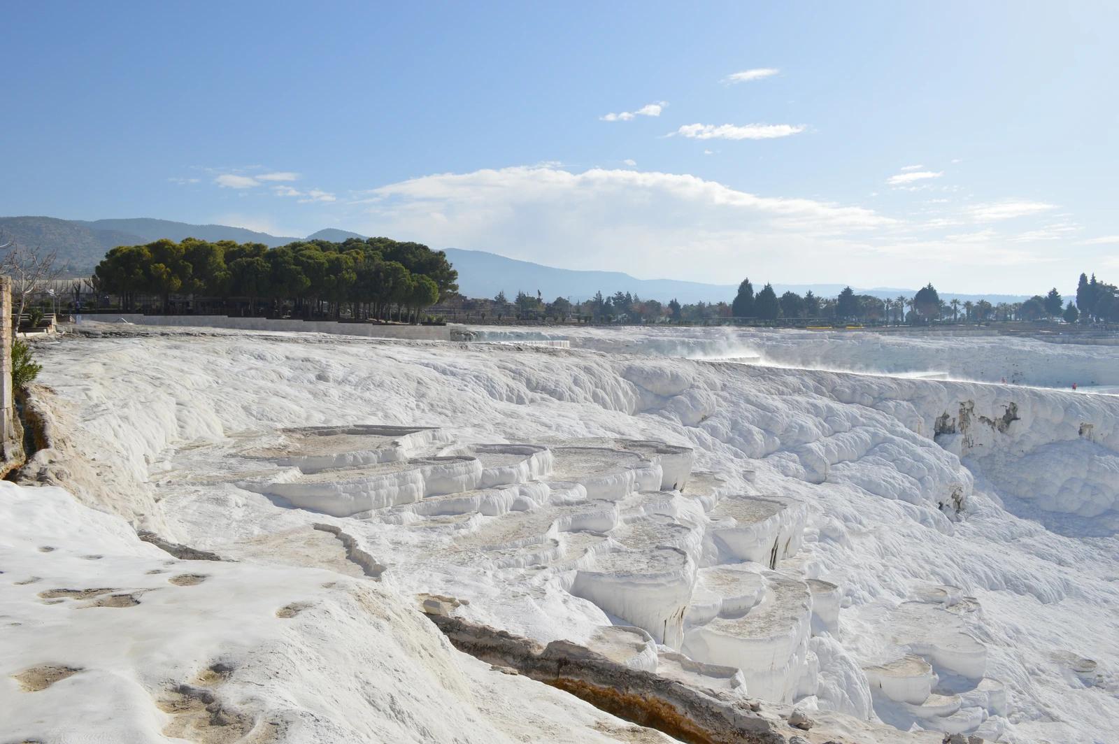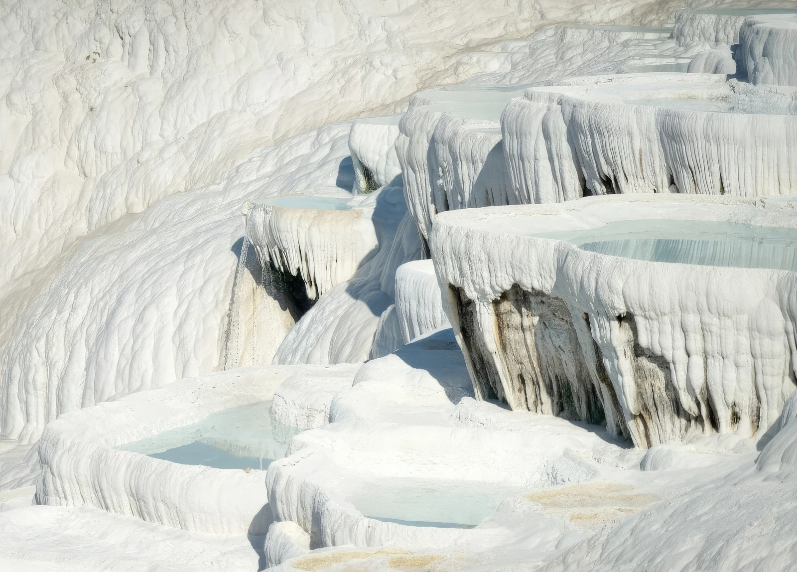 - Travertine Terraces: These are the most iconic feature, formed by the deposition of calcium carbonate from the hot, mineral-rich thermal springs. As the water flows down the cliffside, it cools and hardens, creating a series of shimmering white, terraced basins and petrified waterfalls that resemble a cotton castle. There are 17 hot springs with temperatures ranging from 35∘C (95∘F) to 100∘C (212∘F).
