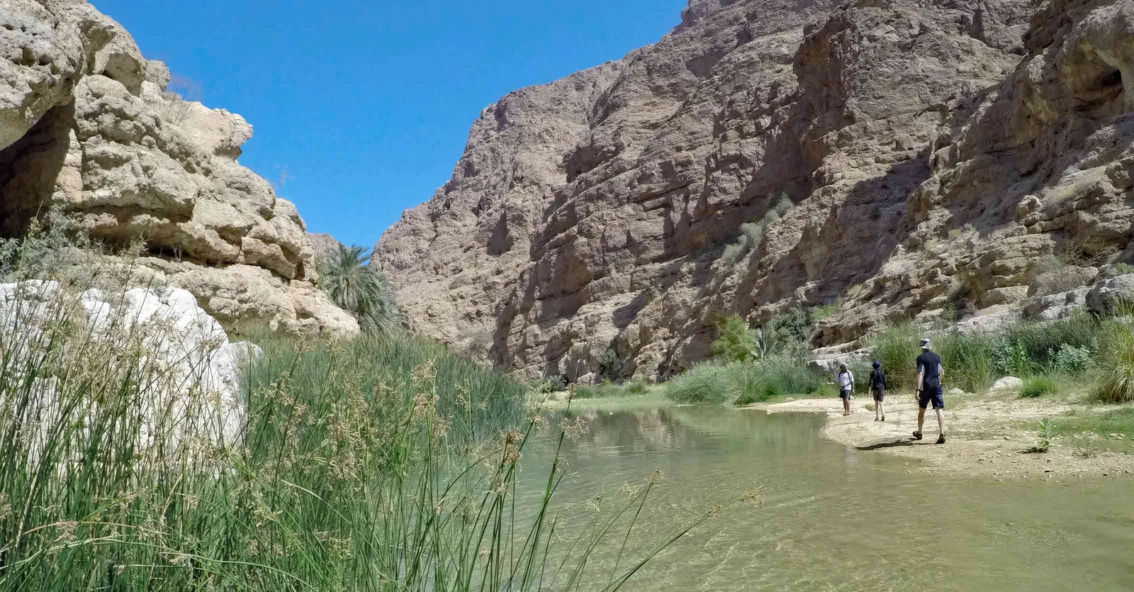 - The Hike: The hike through Wadi Shab is about 3 km (1.8 miles) one way and takes roughly 45-60 minutes at a moderate pace. The trail is rocky and uneven in places, winding along the wadi’s edge, through palm-shaded paths, and across shallow stream crossings. Water shoes or sturdy sandals with good grip are highly recommended.