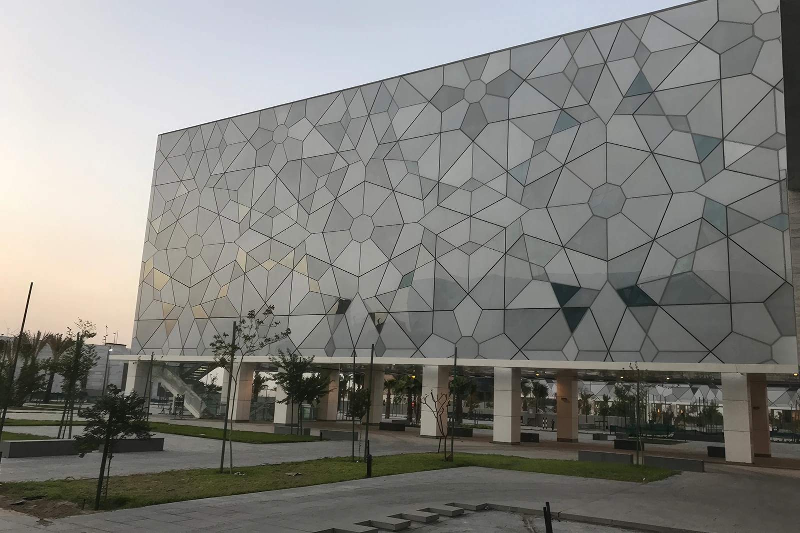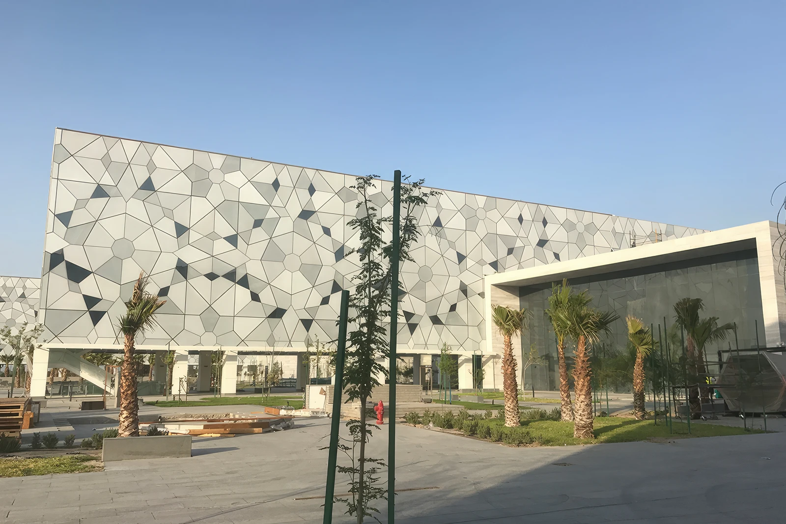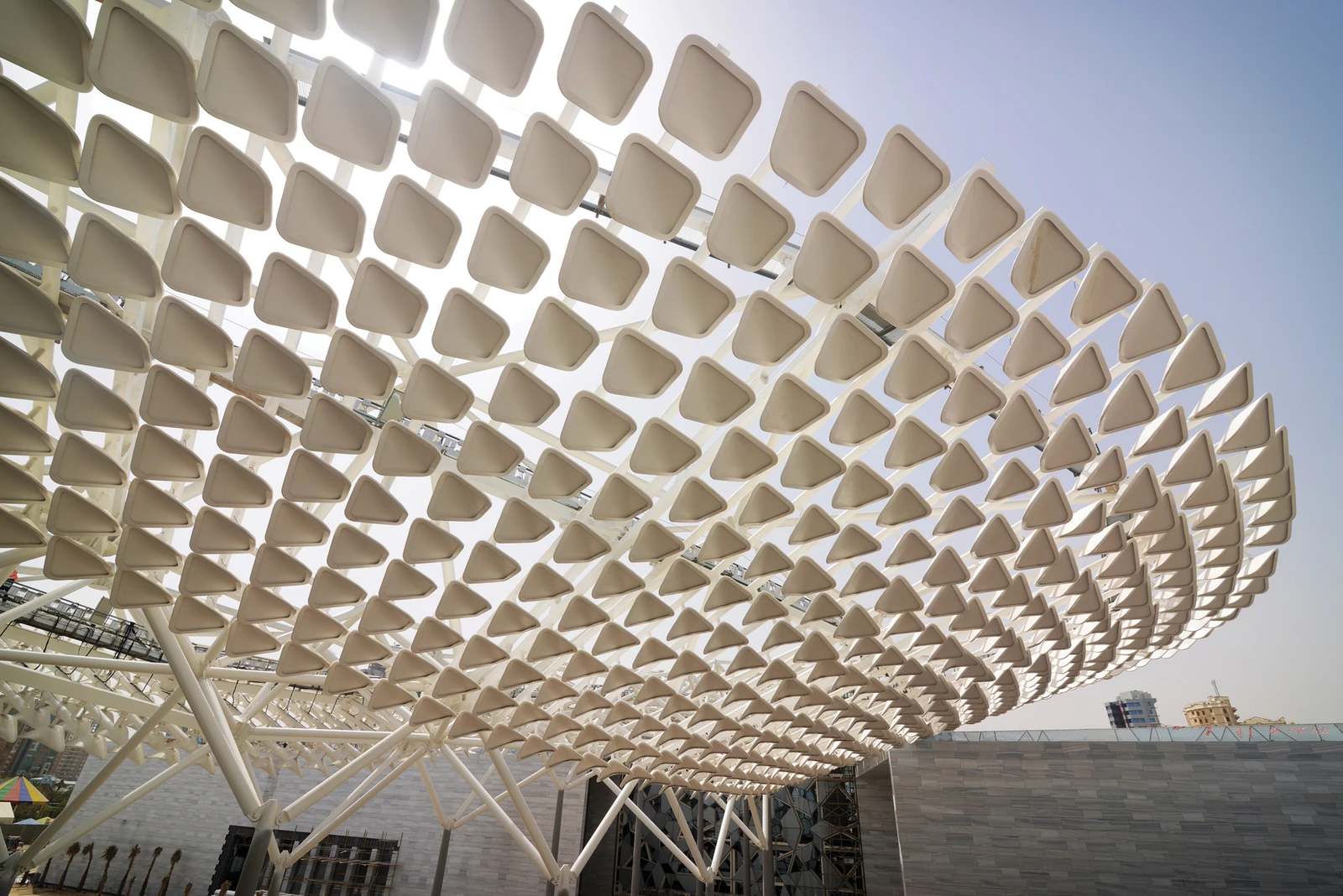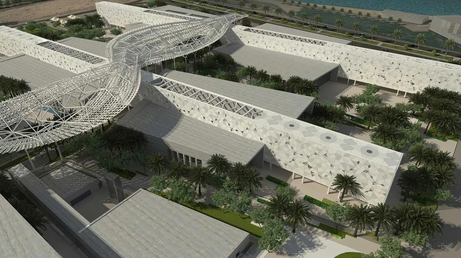 - Interconnected Design: The buildings are connected through glazed wings and a central canopy, creating a covered “street” that meanders and echoes the traditional Kuwaiti “Ferej” (alleyway). This design allows visitors to explore the complex while being shaded and partially climatically controlled.