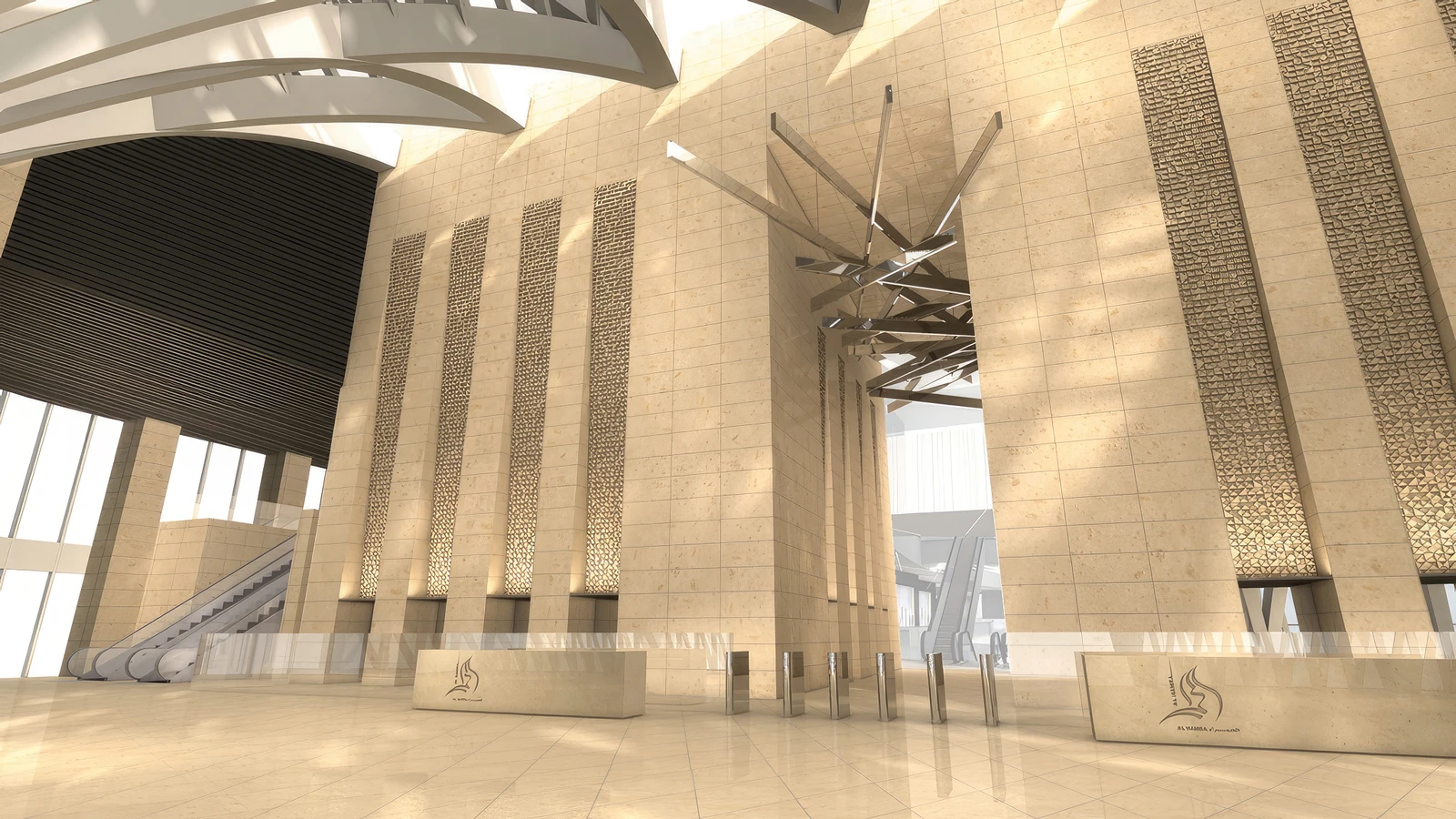 - Materiality: The south facade, exposed to the most severe sun, is clad in brushed Jura limestone, punctured by a series of angled, carved windows designed to minimize solar heat gain. The east, north, and west facades feature curved vision glass, offering panoramic views of the city and Kuwait Bay while optimizing against glare.