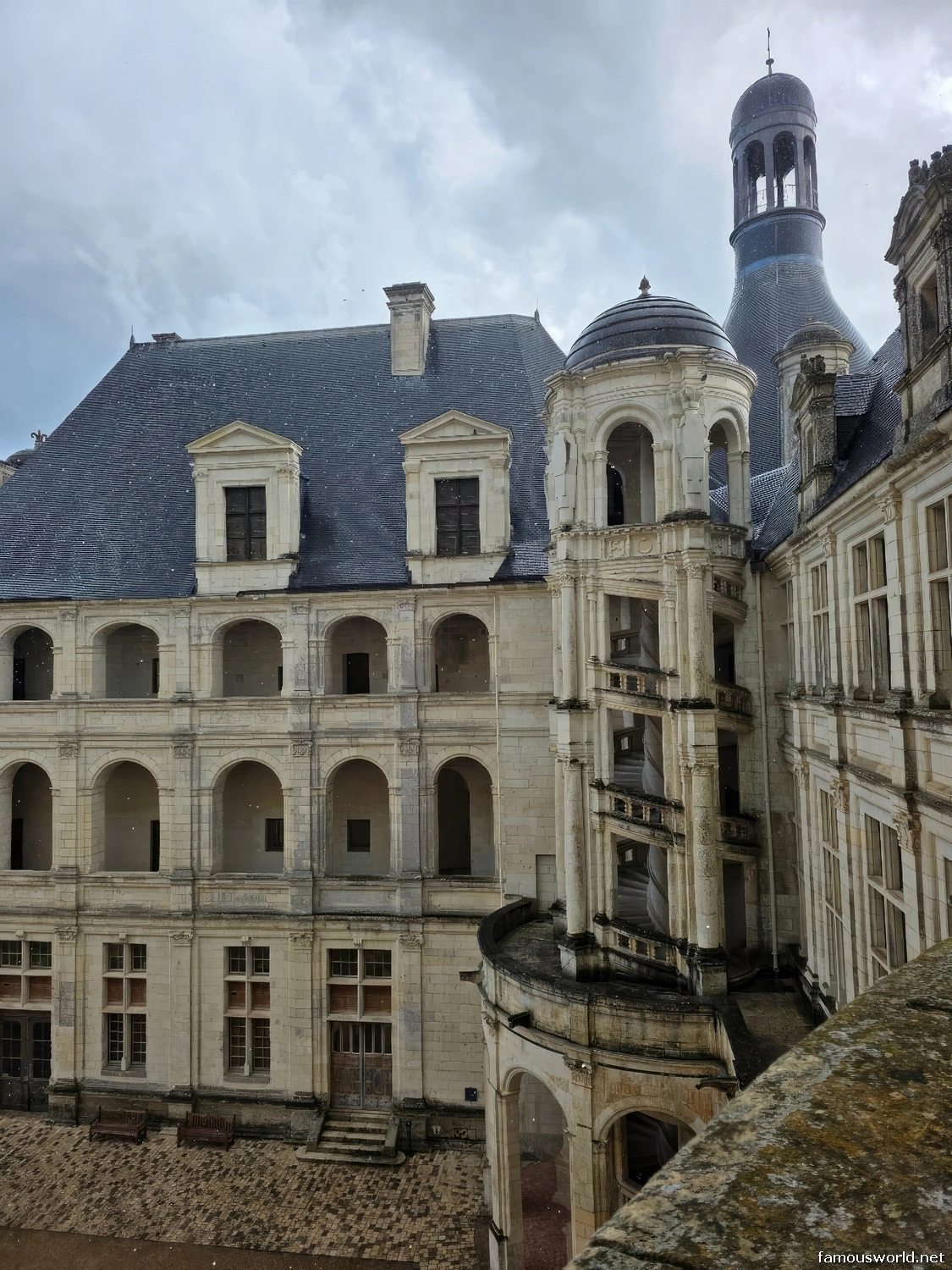 - The Double-Helix Staircase: The château’s centerpiece and most brilliant innovation is a spectacular double-helix staircase, attributed by many to Leonardo da Vinci. Two intertwined spirals ascend three floors without ever meeting, allowing people to see each other through a central column but never cross paths.