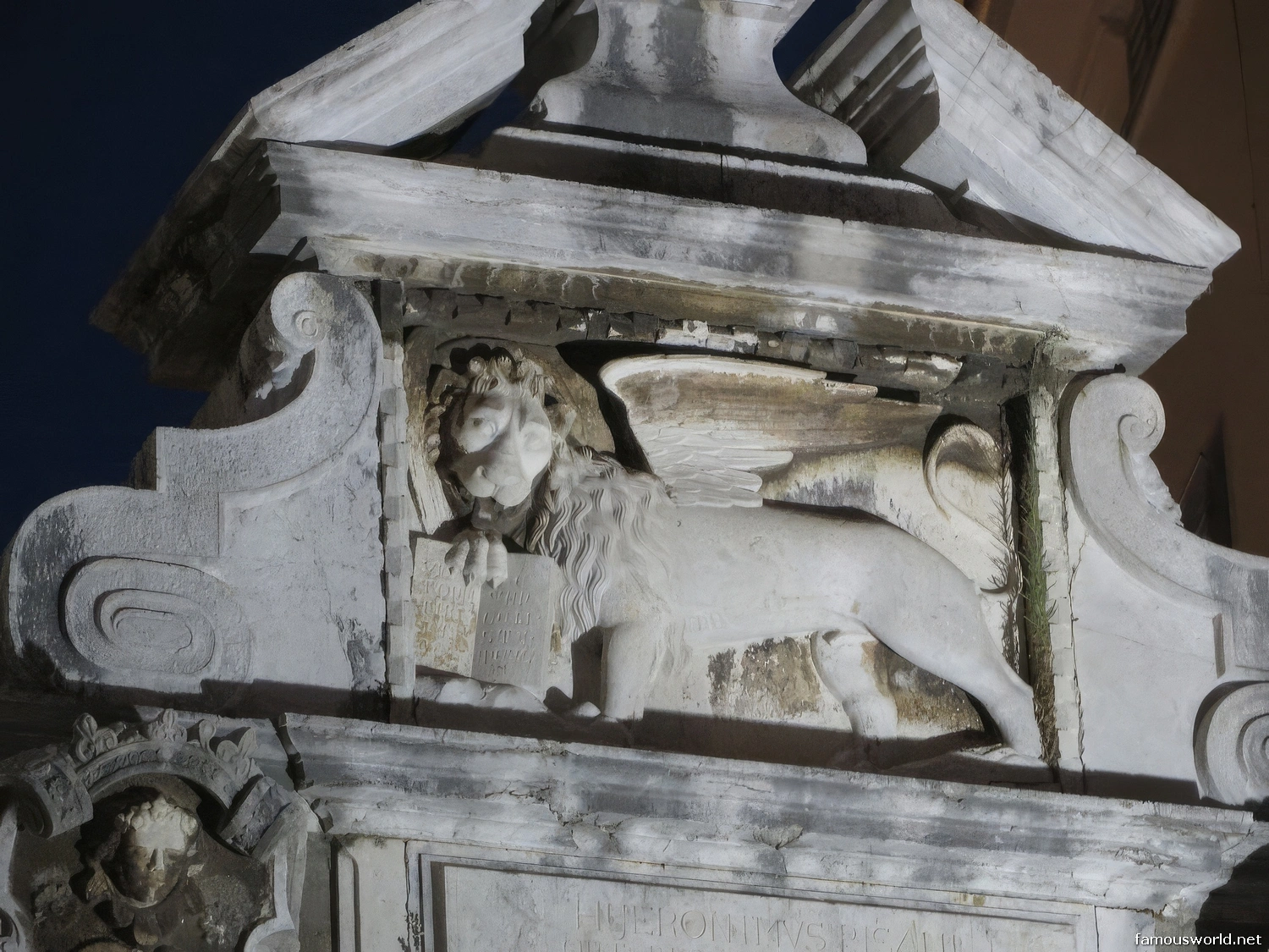 - The Architecture: The arch is a fine example of Baroque stonework, built in 1678-79. Its most notable features are the detailed carvings: the winged Lion of St. Mark (the symbol of Venice) is displayed at the apex, while the outer decorations feature a carved head of a Turk and a head of a Venetian on opposite sides. The coat of arms of the Balbi family is also incorporated into the design.