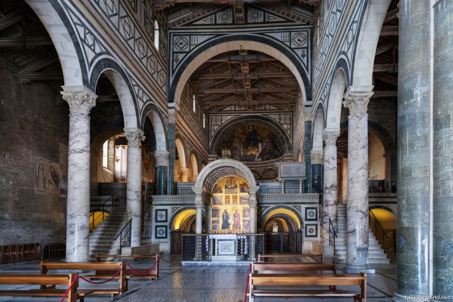 - Interior Details: Inside, the church feels ancient and spiritual. It features a magnificent inlaid marble floor with zodiac motifs, an open timber roof, and a stunning free-standing Renaissance chapel, the Cappella del Crocifisso, designed by Michelozzo in the center of the nave.