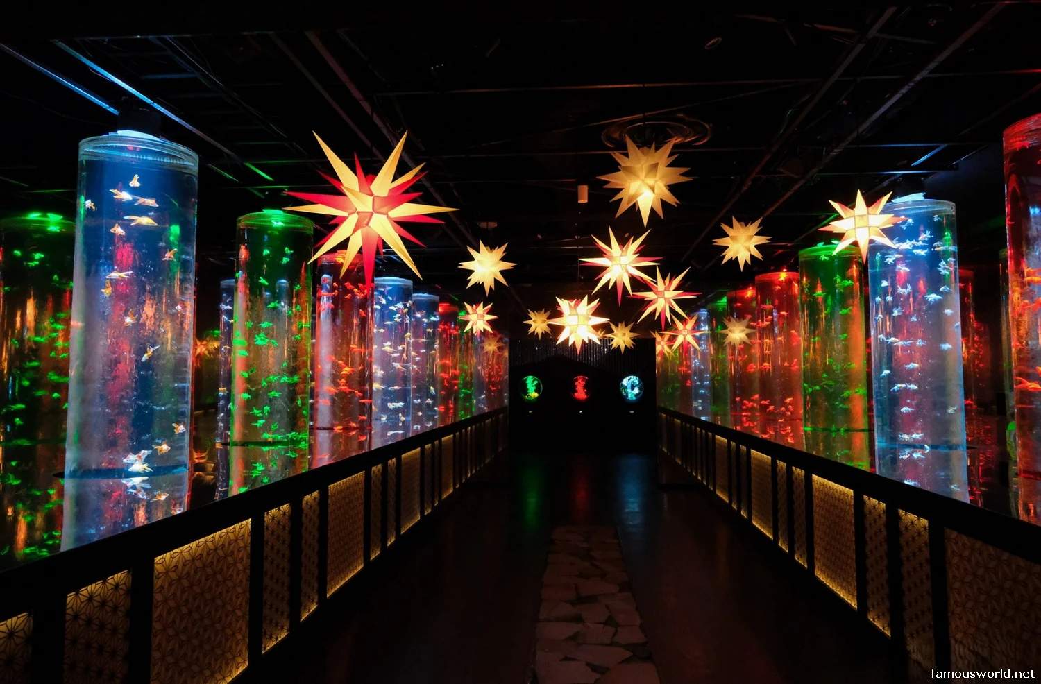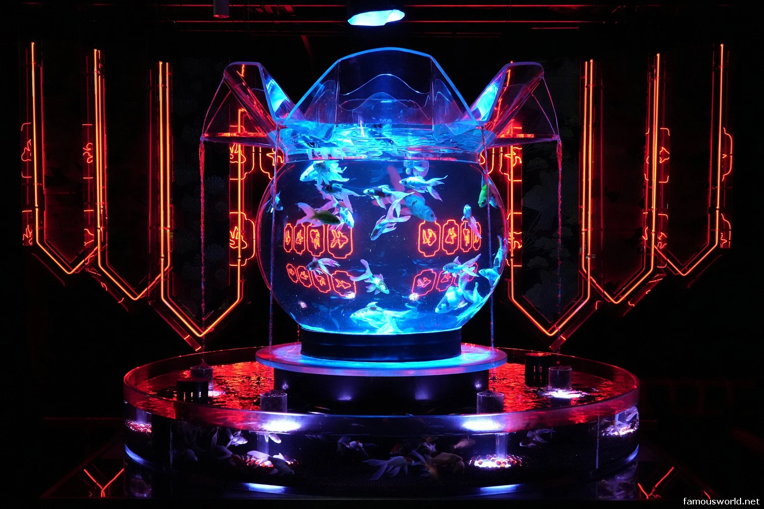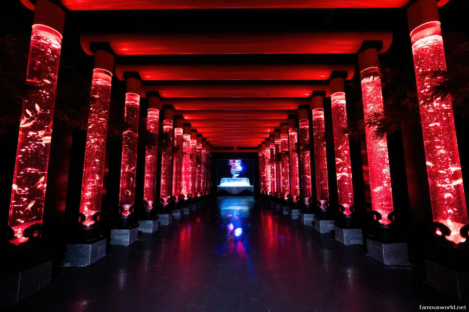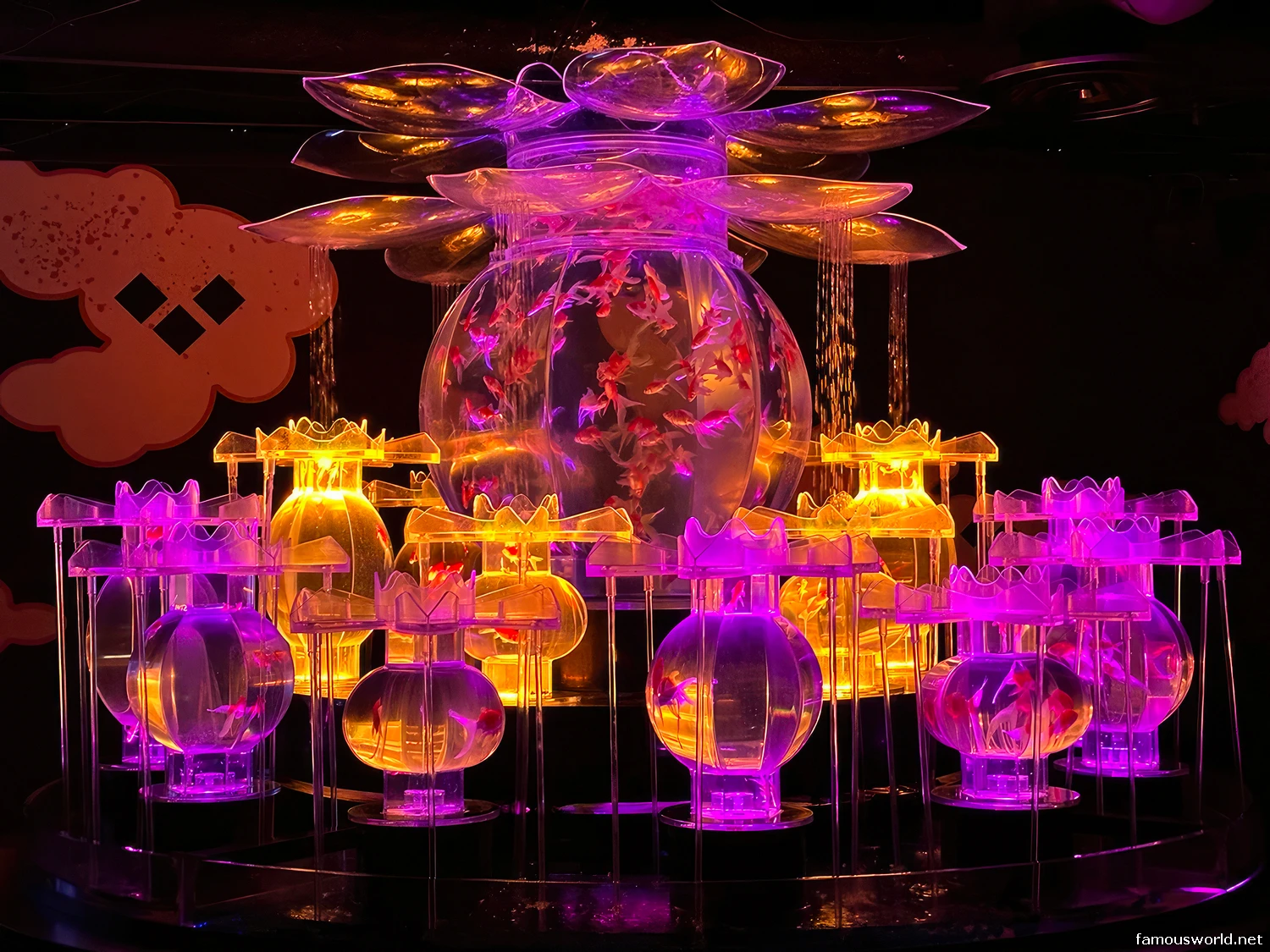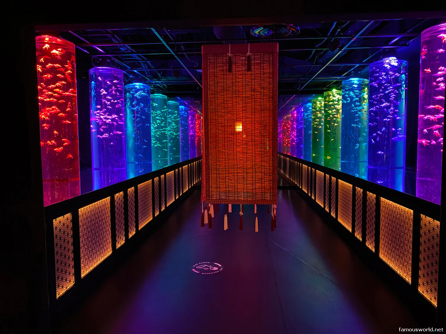 - Goldfish Corridor: A path lined with illuminated vertical columns filled with swimming goldfish, creating the illusion of walking through a mystical temple.