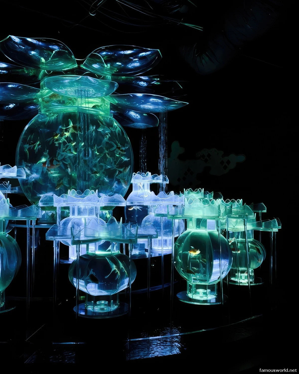 - Interior Design: The museum is a labyrinth of dimly lit corridors and rooms, designed to focus the visitor’s attention entirely on the brilliantly illuminated exhibits. The atmosphere is multisensory, with ethereal music, subtle scents, and the gentle sound of water creating a serene and otherworldly environment.
