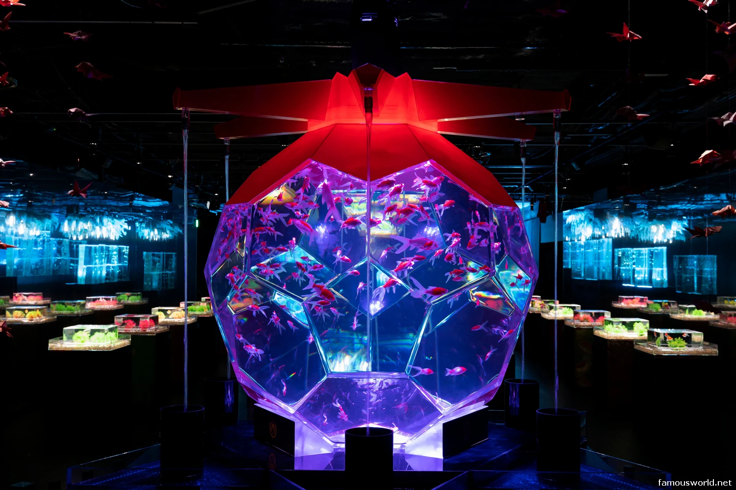 - Artistic Aquariums: The “architecture” consists of the exhibition tanks themselves. These are not standard rectangular aquariums; they are custom-designed sculptural pieces inspired by Japanese culture. You will find aquariums shaped like massive Japanese lanterns (Lanternium), intricate handballs (Temaririum), and folding screens (Byoburium), all crafted to showcase the goldfish in the most artistic way possible.